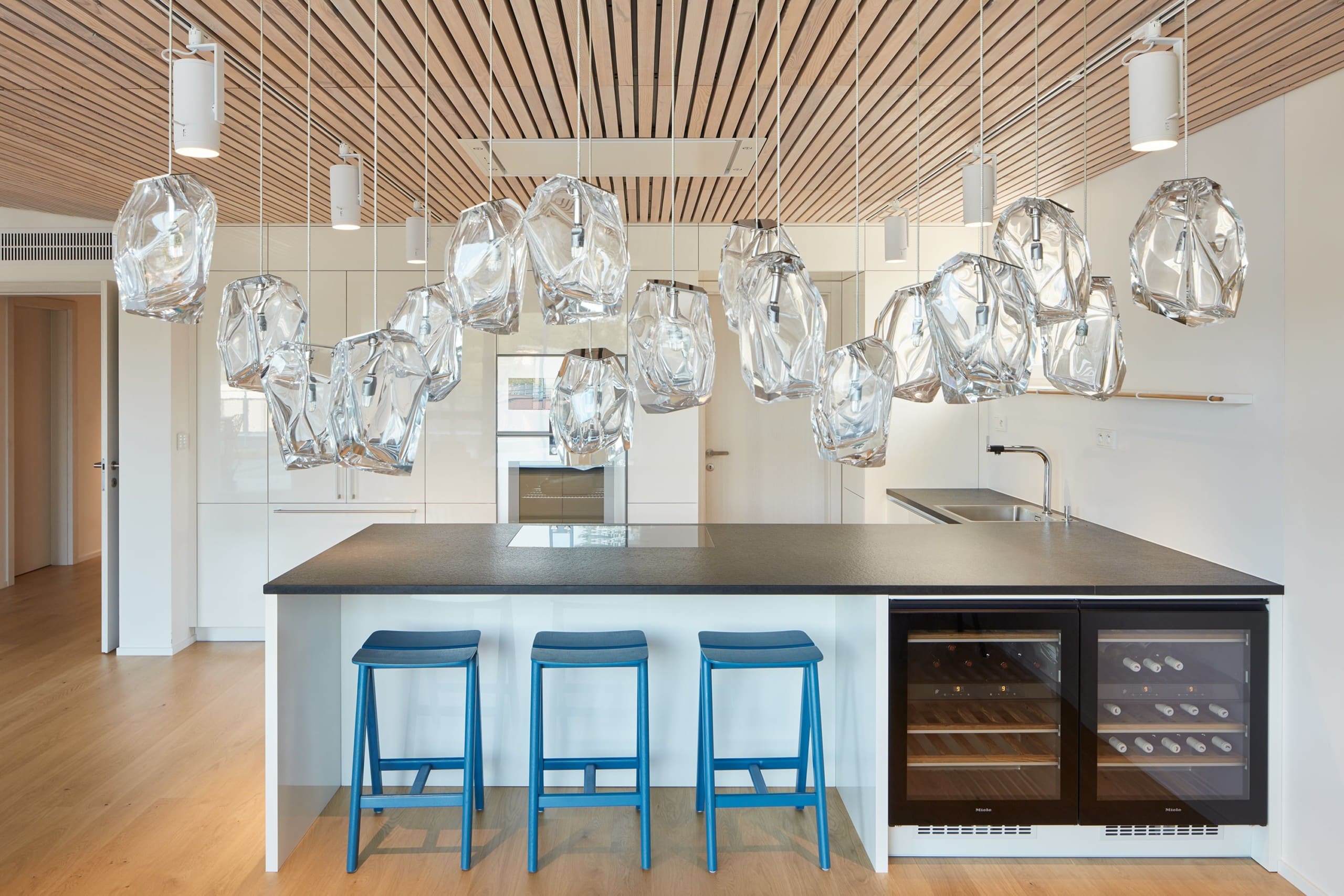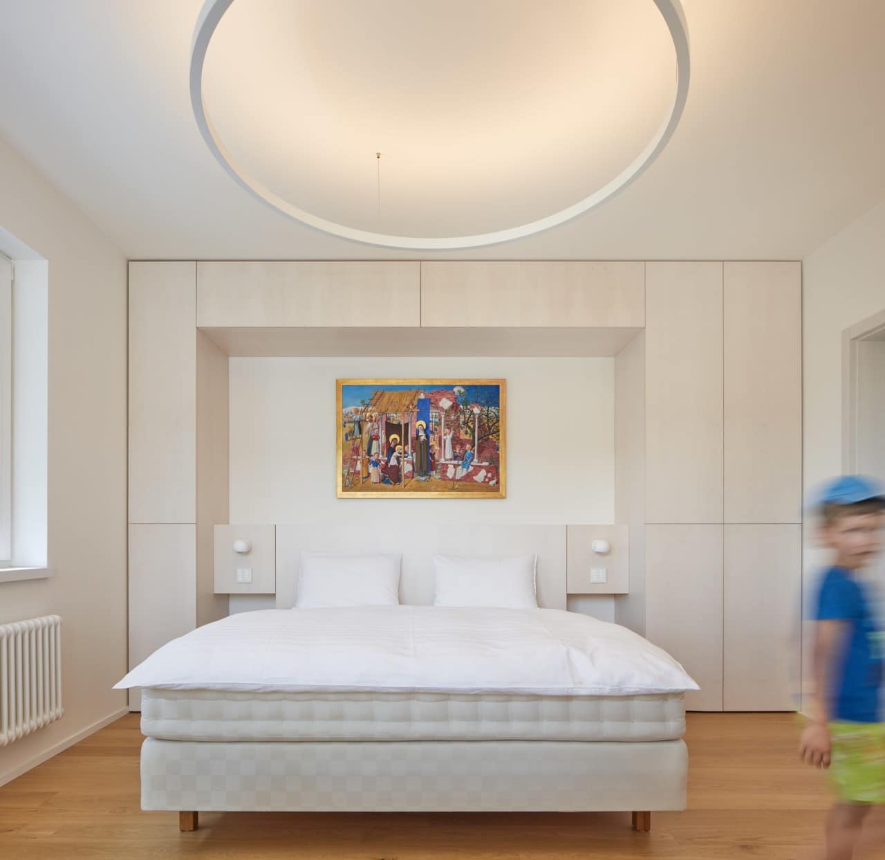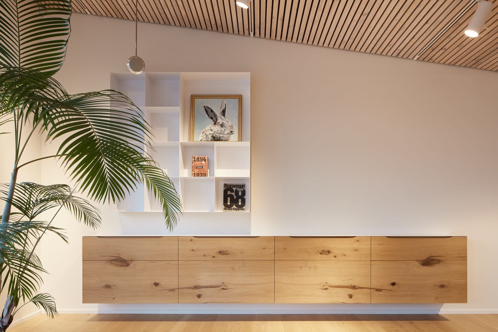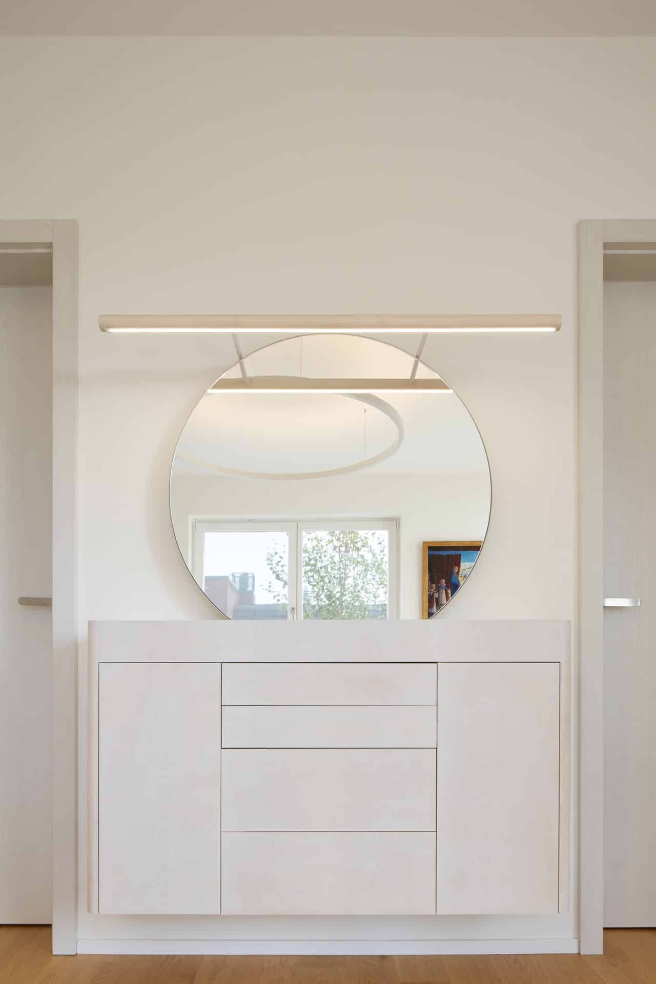 Úděsný originální interiér, jsme oblékli do nového minimalistického hávu. Odstínům hnědi a rustikálnímu vestavnému nábytku, jak vyšitému z devadesátkových katalogů německého outletového obchodu, jsme s radostí dali sbohem a na základech původní dispozice navrhli svěží, moderní interiér. Byt je podkladem pro klientovu sbírku obrazů, se kterými jsme ne nechtěli přetahovat o pozornost.