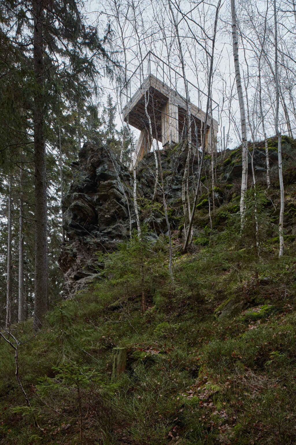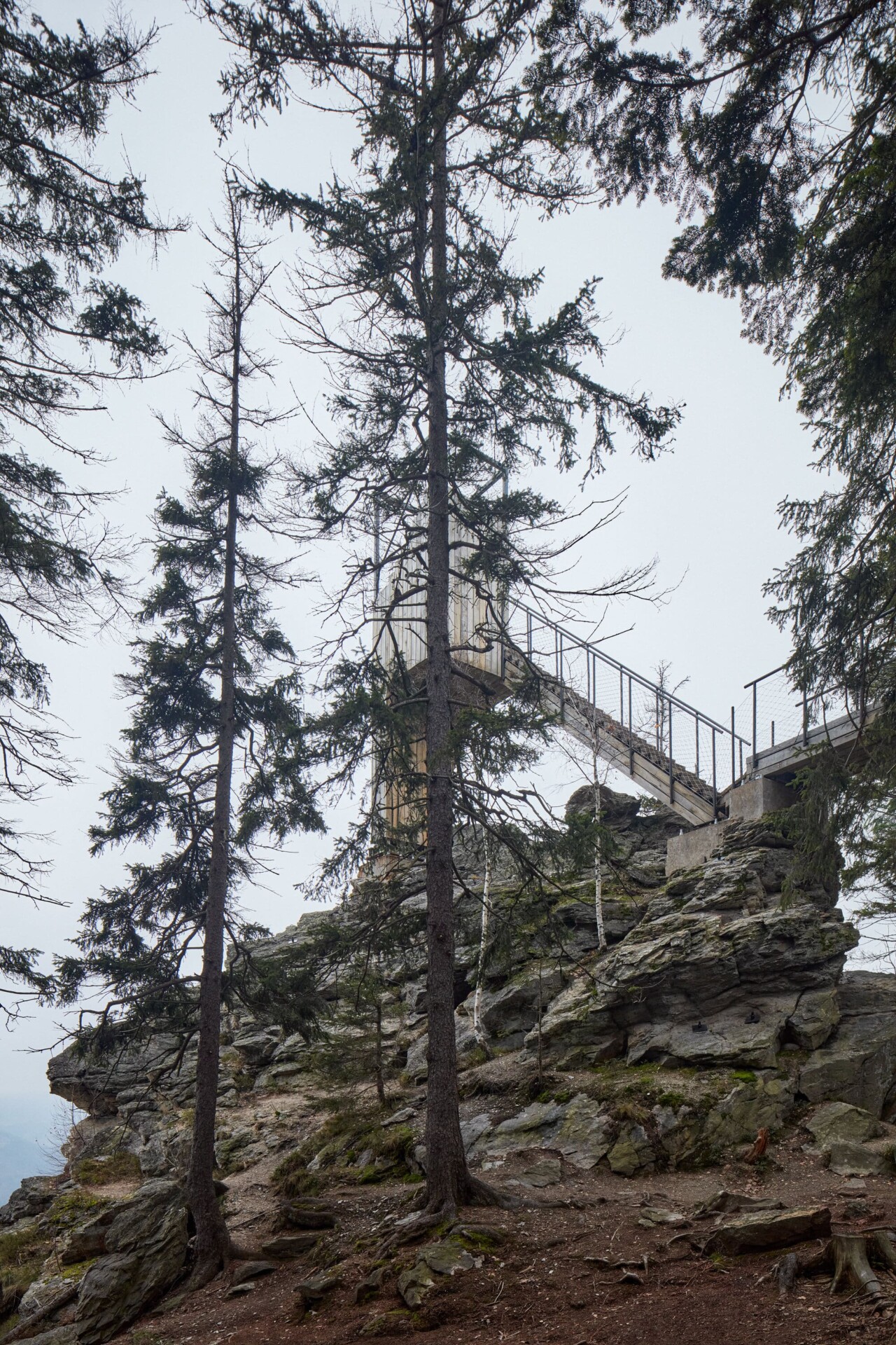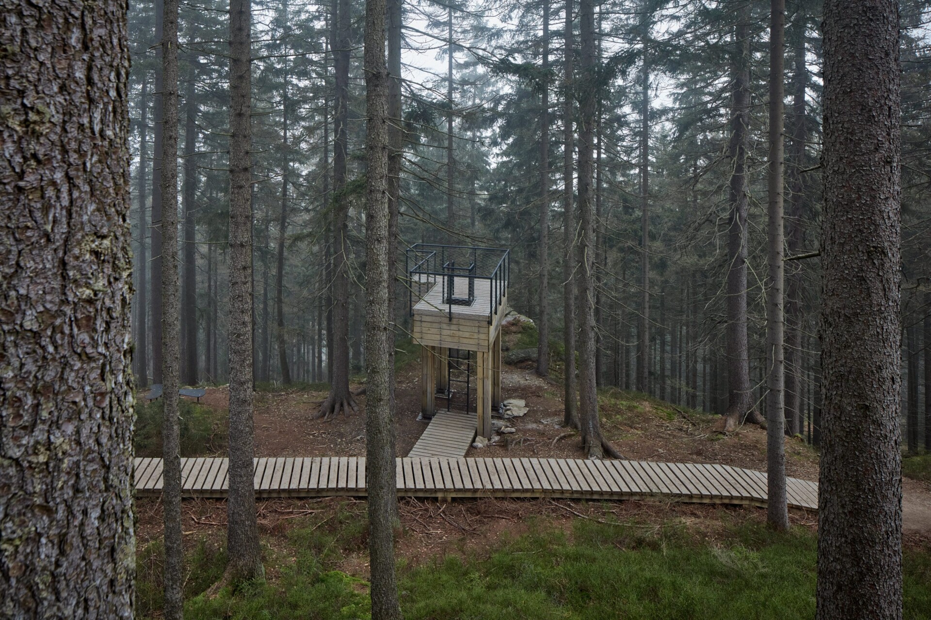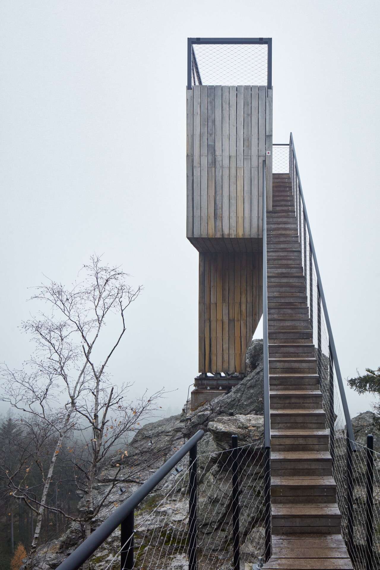 Medvěd se schoval v lese jen kousek od Lišky. Stojí na kusu kamene mezi borůvčím a kouká do korun stromů. Vypadá dobře živený, je ho pořádný kousek. „Vlezte mi na záda!“ Vyzývá Medvěd a zve vás na vyhlídku, která funguje, i když se po horách válí mlha. Když budete mít štěstí, uvidíte datla v akci a když si přivstanete, uvidíte možná i stádo srnek, které se potulují v lesích na vrcholu Stráže. Medvěd je z Dolní Rokytnice, ale vypadá, že se mu tady nahoře líbí. Je tu klid a má rád lidi, tak se nebojte a poslechněte ho. Vlezte mu na záda.