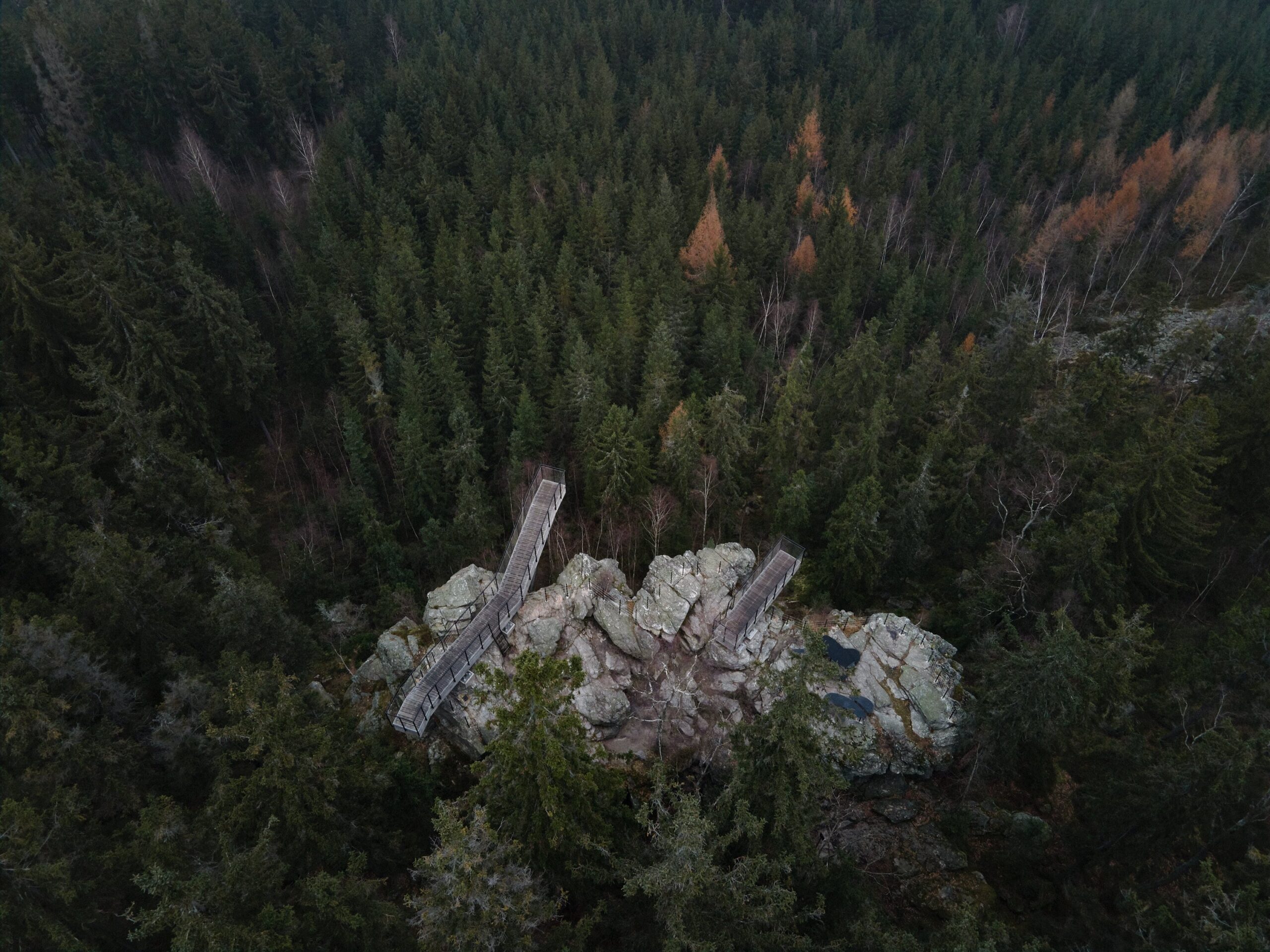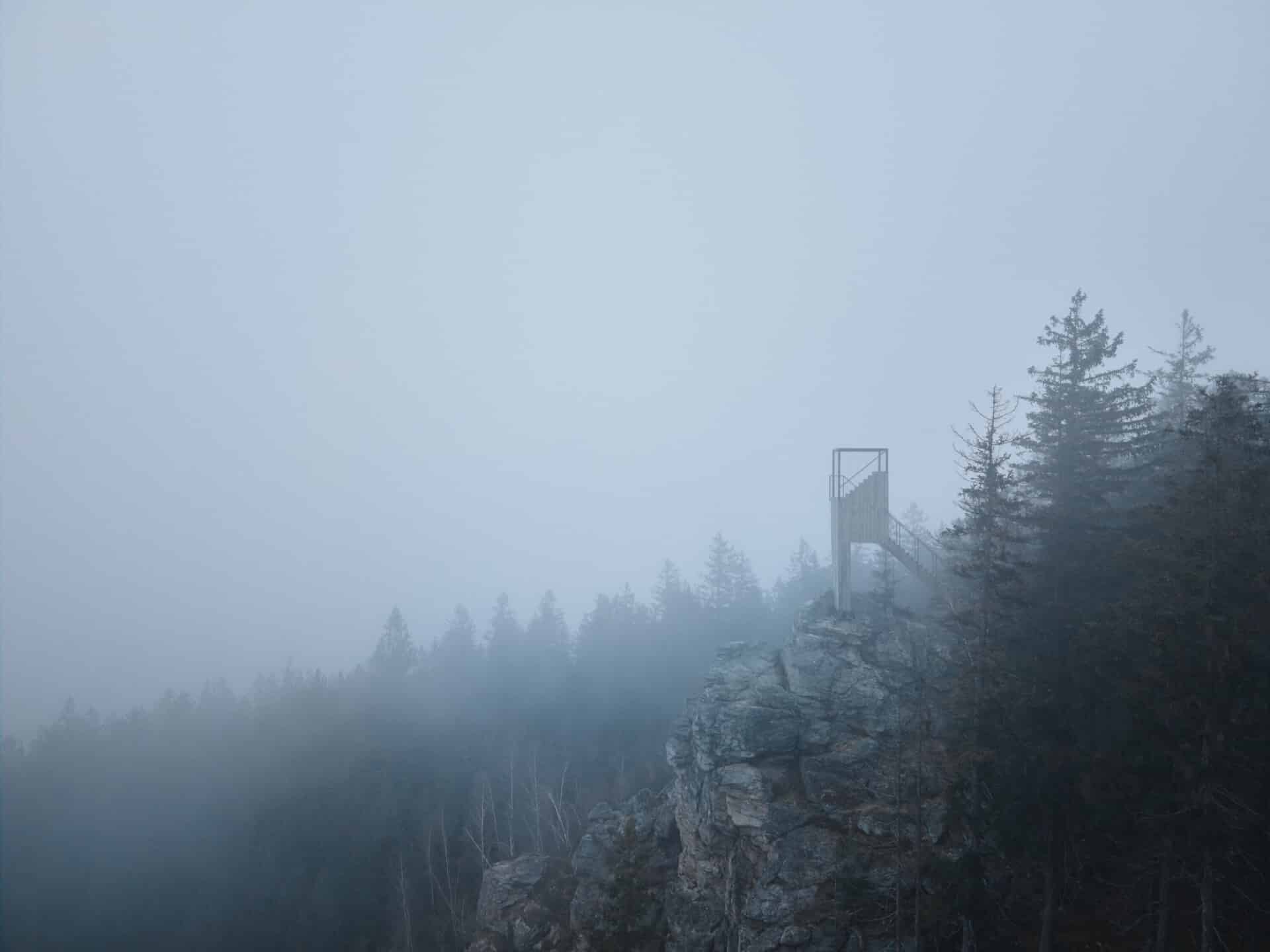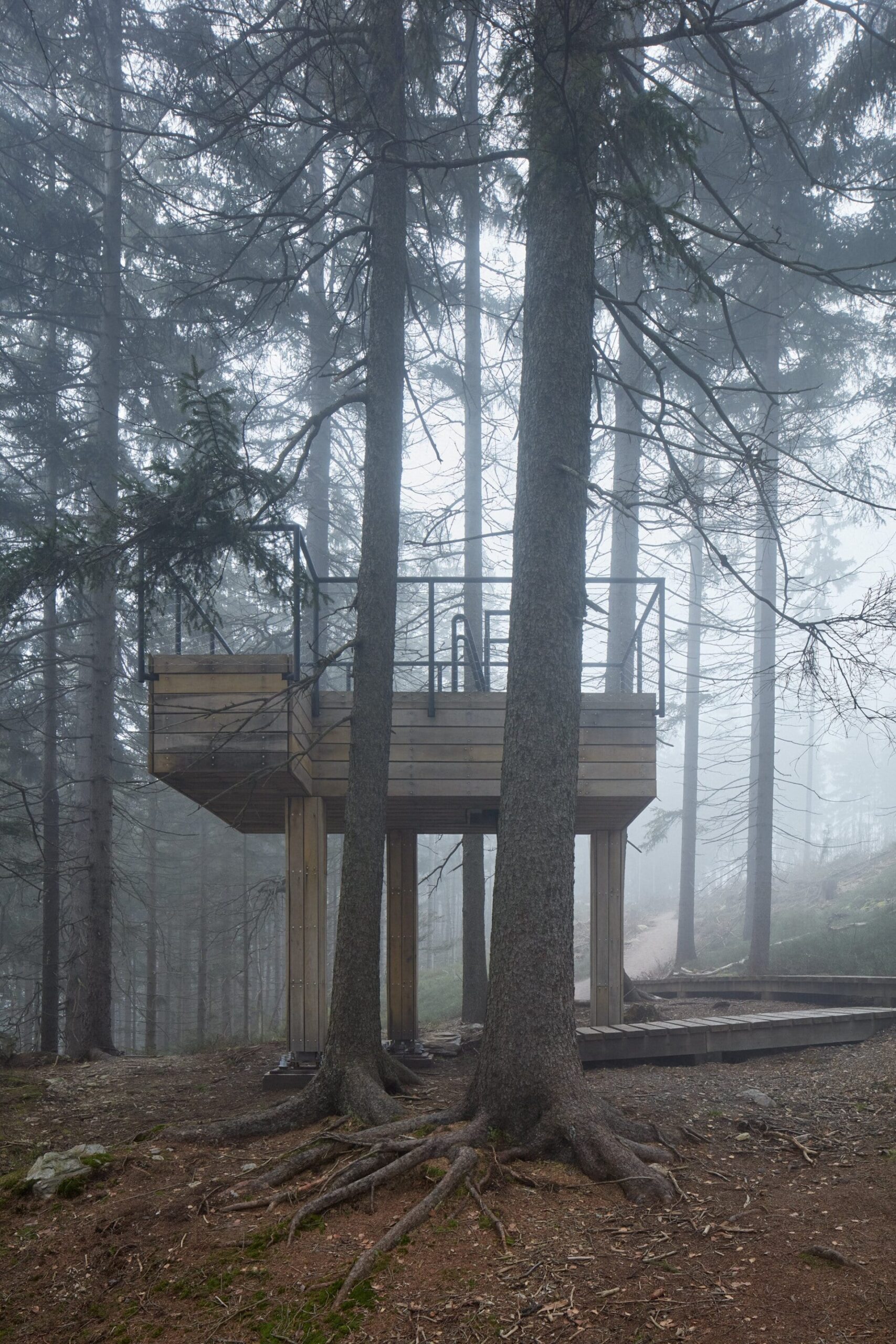 Medvěd se schoval v lese jen kousek od Lišky. Stojí na kusu kamene mezi borůvčím a kouká do korun stromů. Vypadá dobře živený, je ho pořádný kousek. „Vlezte mi na záda!“ Vyzývá Medvěd a zve vás na vyhlídku, která funguje, i když se po horách válí mlha. Když budete mít štěstí, uvidíte datla v akci a když si přivstanete, uvidíte možná i stádo srnek, které se potulují v lesích na vrcholu Stráže. Medvěd je z Dolní Rokytnice, ale vypadá, že se mu tady nahoře líbí. Je tu klid a má rád lidi, tak se nebojte a poslechněte ho. Vlezte mu na záda.