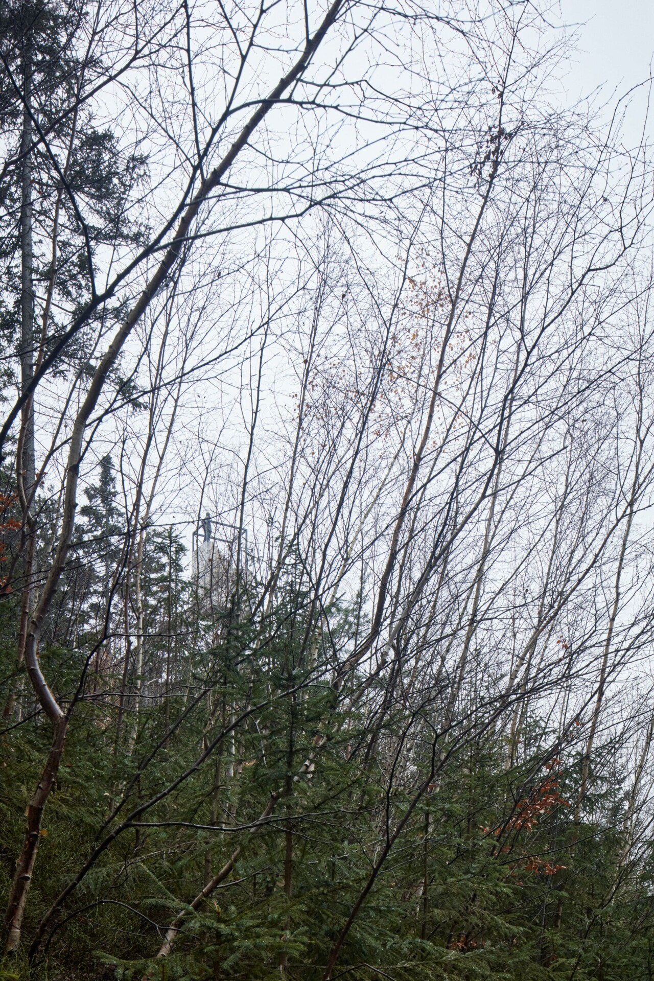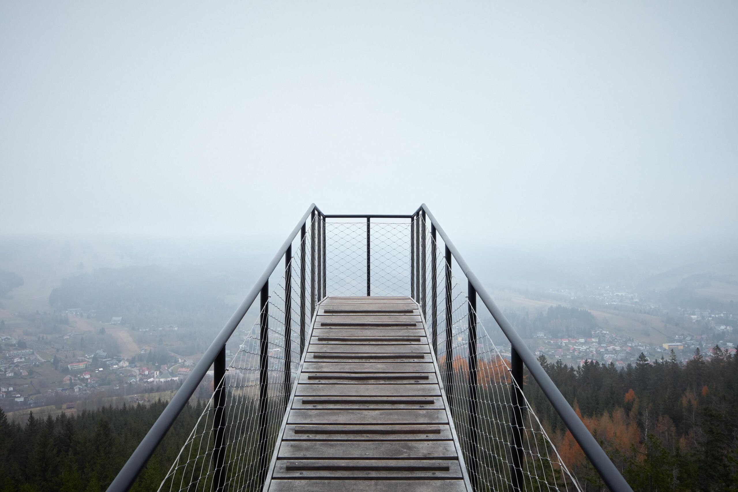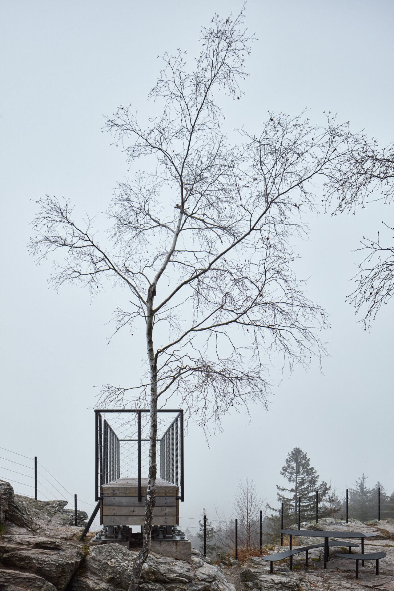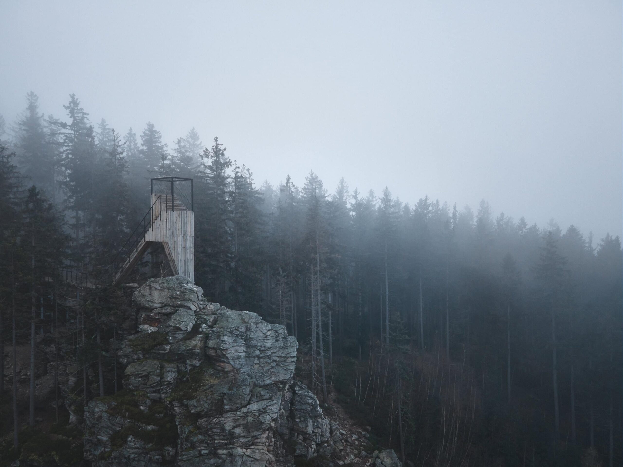 Medvěd se schoval v lese jen kousek od Lišky. Stojí na kusu kamene mezi borůvčím a kouká do korun stromů. Vypadá dobře živený, je ho pořádný kousek. „Vlezte mi na záda!“ Vyzývá Medvěd a zve vás na vyhlídku, která funguje, i když se po horách válí mlha. Když budete mít štěstí, uvidíte datla v akci a když si přivstanete, uvidíte možná i stádo srnek, které se potulují v lesích na vrcholu Stráže. Medvěd je z Dolní Rokytnice, ale vypadá, že se mu tady nahoře líbí. Je tu klid a má rád lidi, tak se nebojte a poslechněte ho. Vlezte mu na záda.