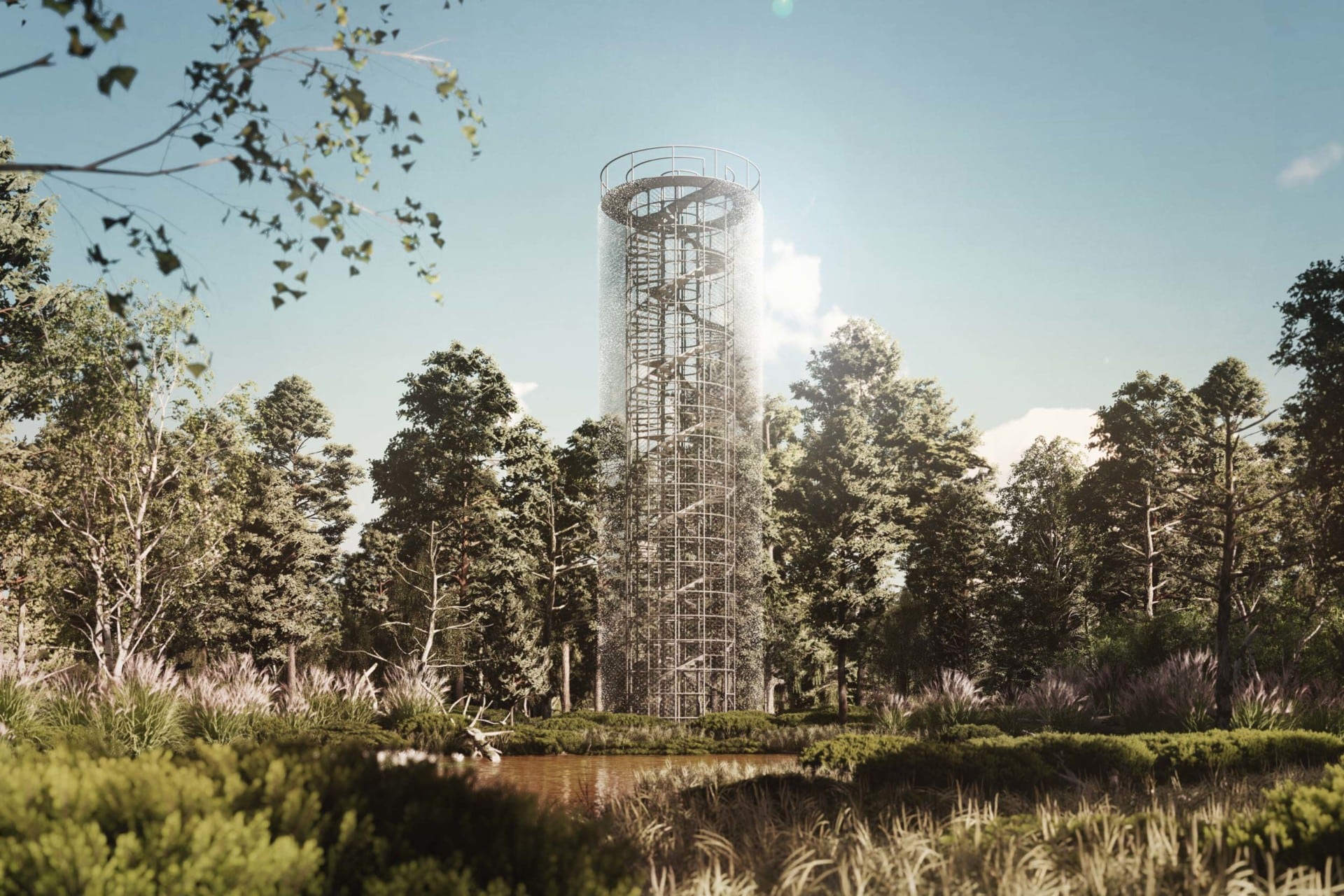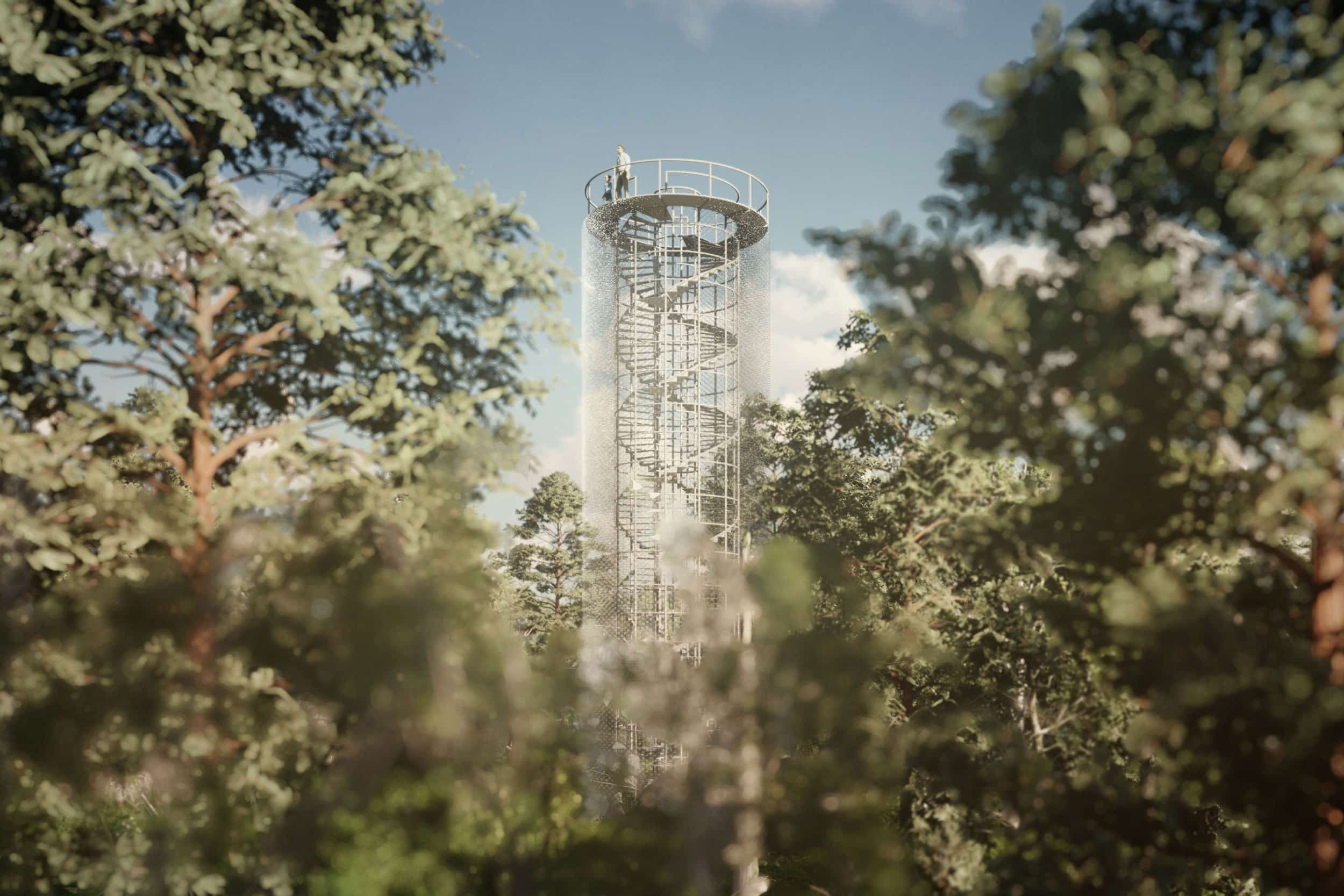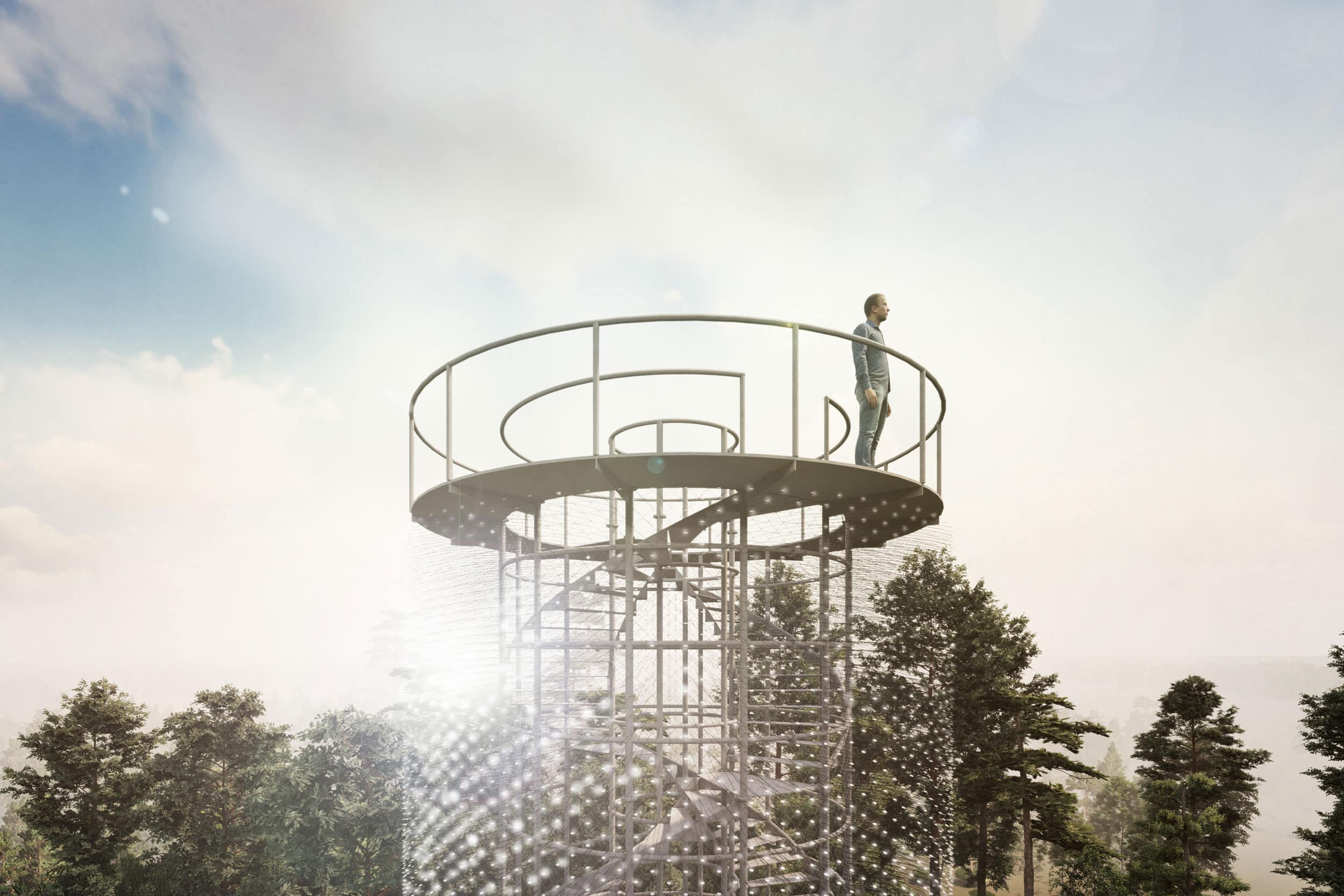 Ve vzduchu je cítit rašelina, mezi stromy se zvedá mlha a v dálce se do větru vlní rozhledna. Vlní se a leskne jako nějaký mikroskopický živočich, který se