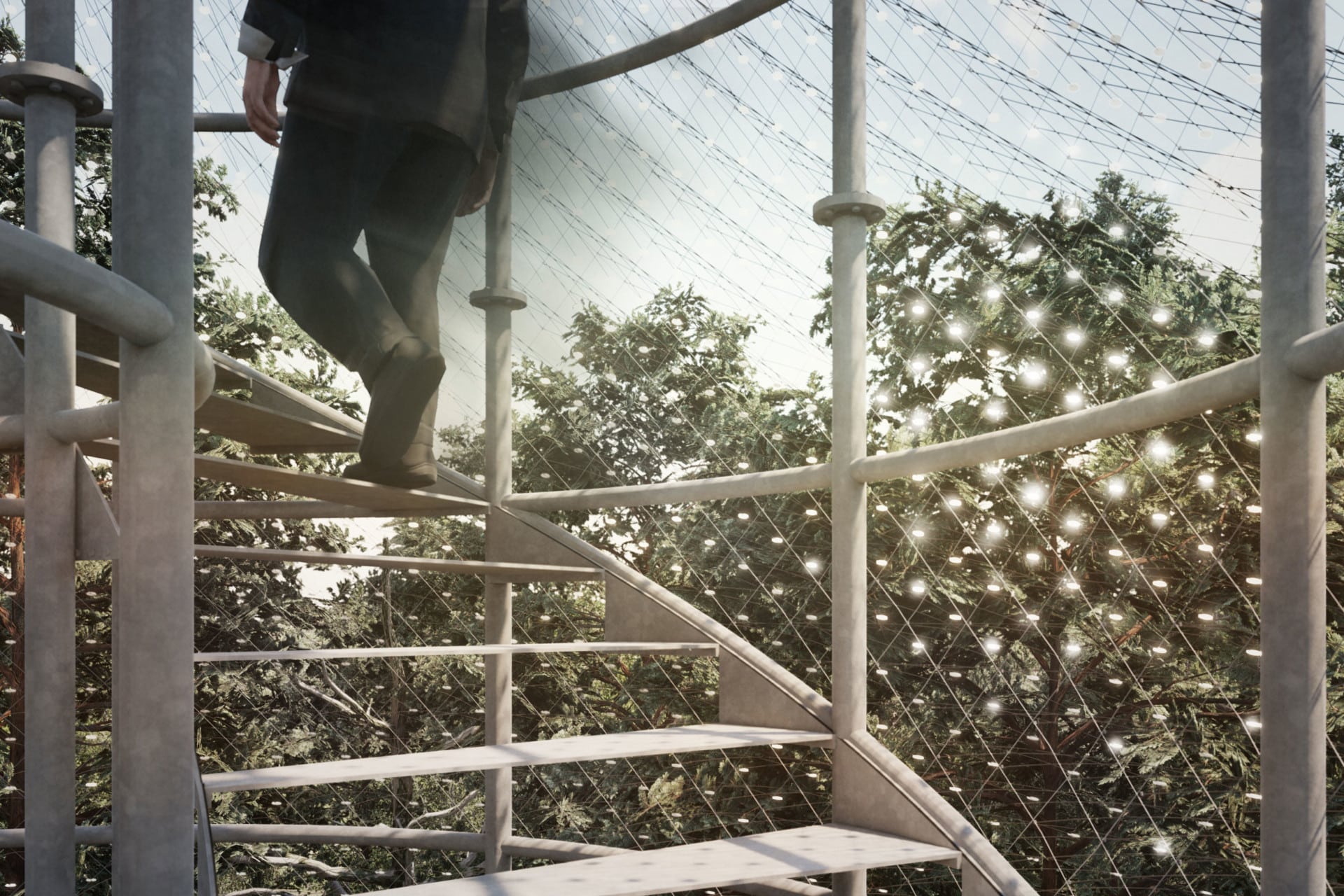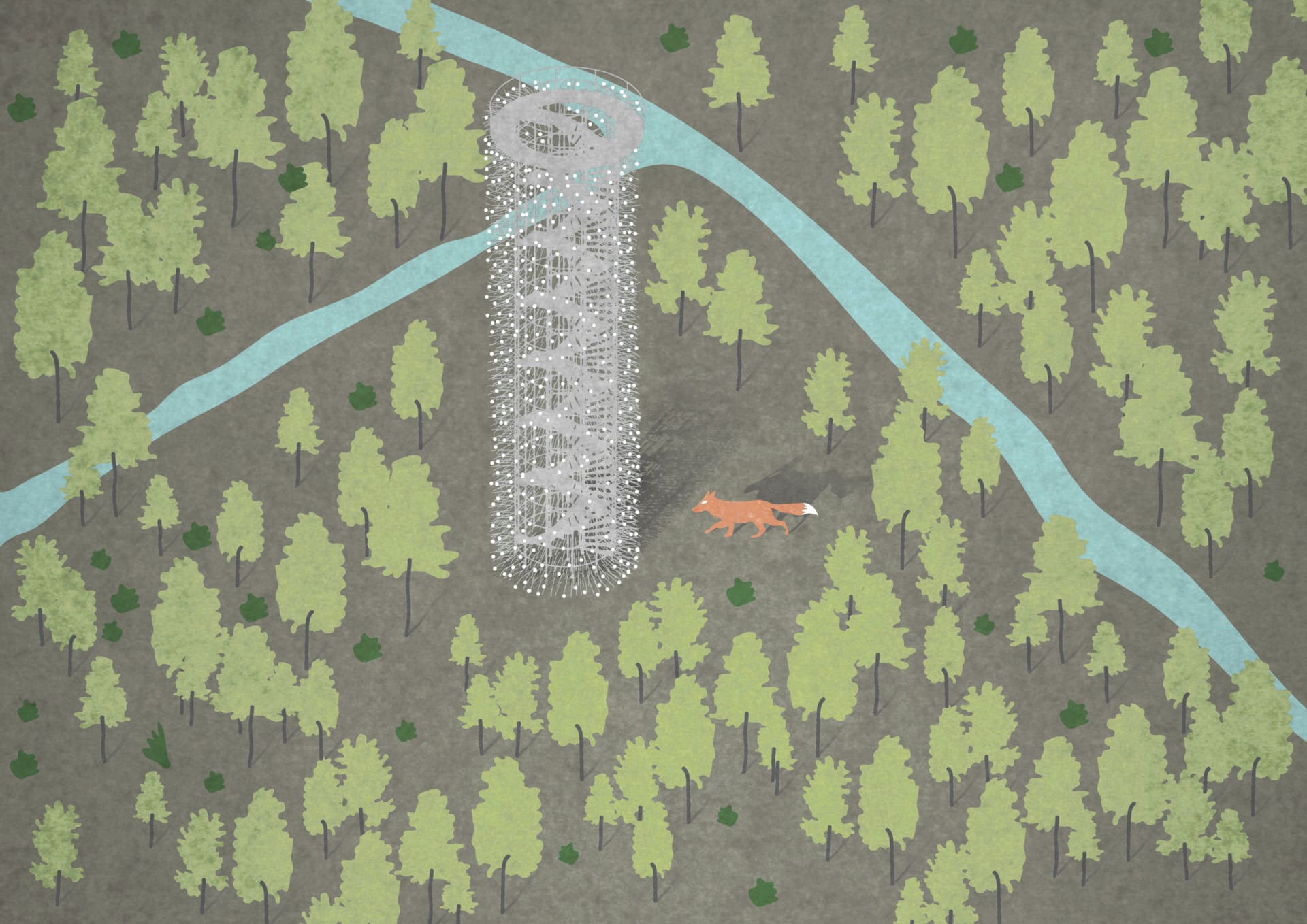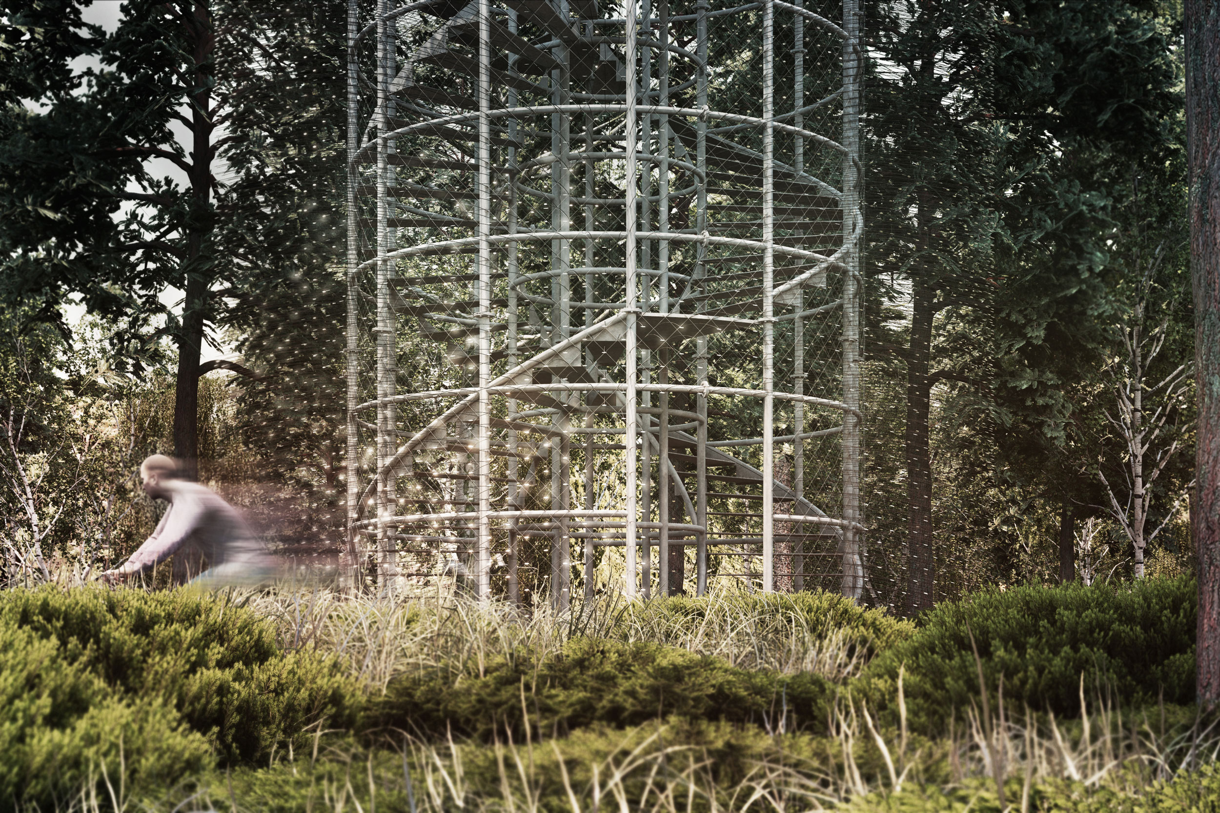 Ve vzduchu je cítit rašelina, mezi stromy se zvedá mlha a v dálce se do větru vlní rozhledna. Vlní se a leskne jako nějaký mikroskopický živočich, který se